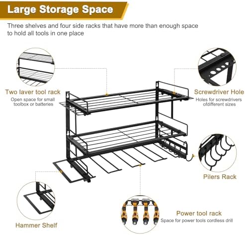 BNNMKL Power Tool Organizer Wall Mount, 3 Layers Cordless Drill Storage Rack, Super Large Storage Rack for Power Tool Drill, Screwdriver and Drill Holder Battery Rack or 4 Drill Holders