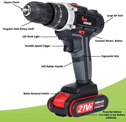 Cordless Drill Driver Kit with 2 battery, King Showden 21V Power Drill 50Nm 25+3 Clutch, 3/8″ Keyless Chuck, Variable Speed & Built-in LED Electric Screw Driver for Drilling Wall, Bricks, Wood, Metal
