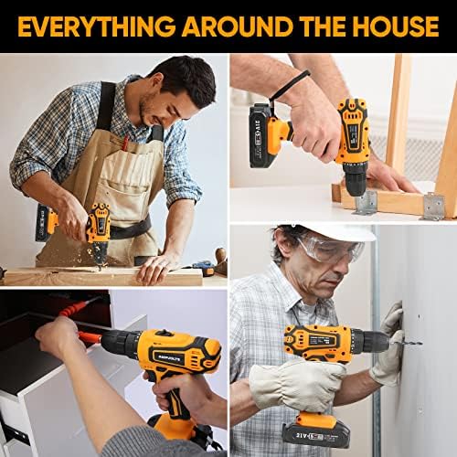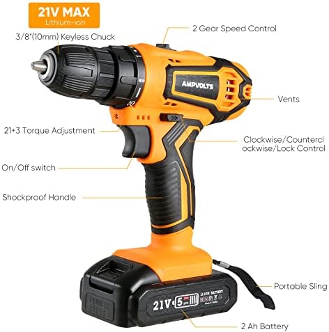Cordless Drill Set, Ampvolts 21V Max Lithium-Ion Cordless Power Drill, 0-350 RPM/0-1400 RPM Variable Speed, 25+1 Clutch Style, 3/8″ Metal Chuck, 2.0Ah Battery, 24-Piece Accessories