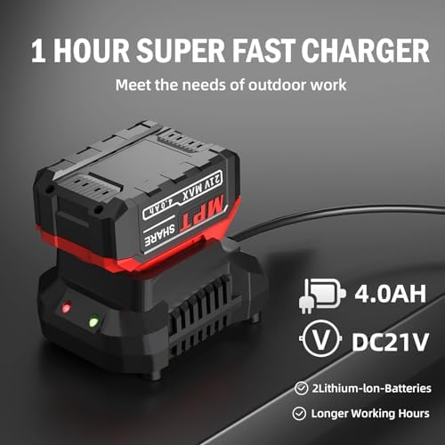 【Rechargeable 4.0Ah Lithium-Ion Battery】 MPT 21V Platform battery can be paired with any MPT 21v platform products, such as 21v impact wrench, 21v cordless drill, 21v cordless angle grinder. Multiple intelligent protection makes the battery life longer. Fast charger adds smart sensing design can product battery better while charging.