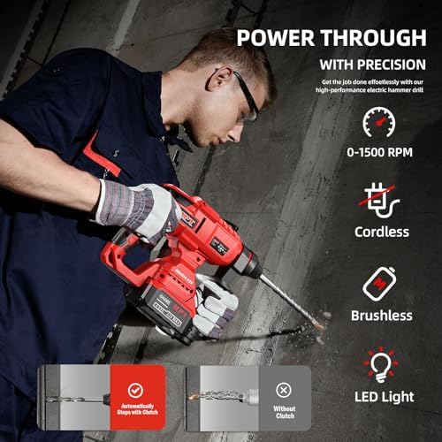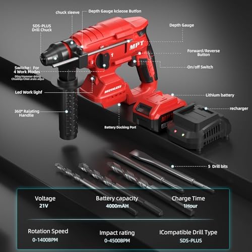 Cordless Rotaty Hammer Drill – MPT 21v Cordless 7/8’’-SDS Plus Brushless Rotary Hammer Drill with Safety Clutch, 4.0Ah Battery, Fast Charger & Tool Bag, 4 Functions Variable Speed