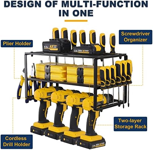 🧰【2 Pack Power Tool Organizers】Craftforce tool organization set comes with 2 pack power tool organizers. Each pack of organizer has 2-Layer shelf and 4 drill holders, 33 screwdriver organizers, 7 plier holders, in short, the 3-layers design with double sides holders has enough space for your tools, so two pack tool organizers fully meet all your warehouse tool organization needs.