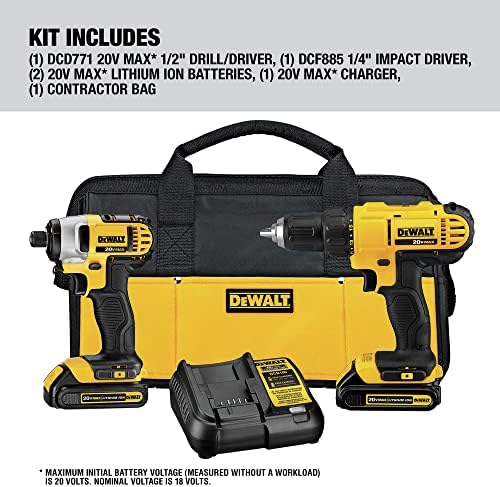 This DEWALT 20V max Lithium Ion Drill Driver/Impact Driver Combo Kit comes with DEWALT cordless tools including the DCD771 20V max 1/2-inch Drill/Driver, and the DCF885 1/4-inch Impact Driver. Both have a compact and lightweight design to fit into tight areas, as well as an ergonomic handle for comfort and control. The DCK240C2 in DEWALT tool kit is ideal of completing a wide range of applications. LED foot light for superior visibility.