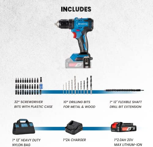DongCheng Cordless Drill Driver 20V Max,1/2” Keyless Chuck Brushless Power Drill (0-600/2000RPM) with 42pcs Drilling/Driver Kit, 2.0 Ah Li-ion Battery and Fast Charger, DCJZ2050