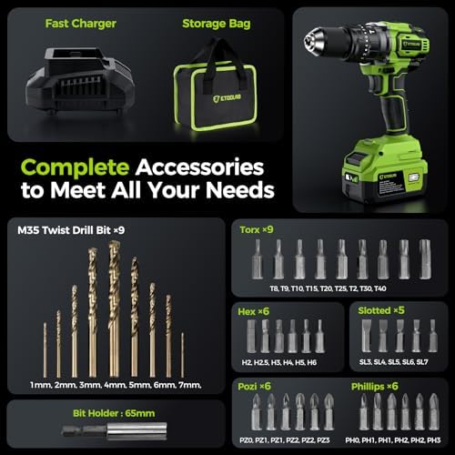 ETOOLAB Power Drill Cordless Drill with Battery and Charger, 20V Drill Set(70N·m Max) Electric Drill Driver with 4Ah Battery, 32 Screwdriver Bits, 9 Drill Bits, 3/8-Inch Keyless Chuck, 20+1+1 Position