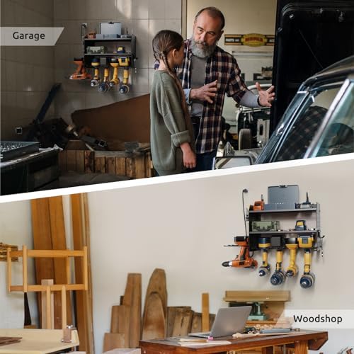 【Optimal 3-Layer Organization】 L:16.5″ x W:8.7″ x H:12″. Featuring 4 main drill slots, 2 additional side storage slots, 4 hooks, and drill bit rack. Integrated power strip. Double-layered design with adjustable second layer for personalized space.