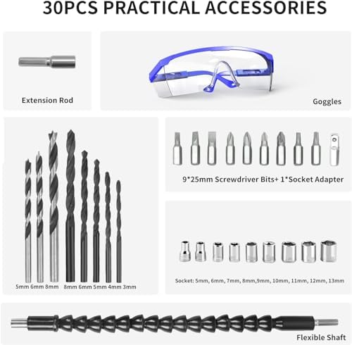 ✅【What Will You Get?】Our drill set include: 21V Cordless Drill*1, 1.5Ah Battery*1, Fast Charger*1, HSS Twist Drill Bits*5, Wood Drill Bits*3, Screwdriver Bits*9, Socket Adapter*1, Extension Rod*1, Sockets*9, Flexible Shaft*1, Goggles*1, User Manual*1