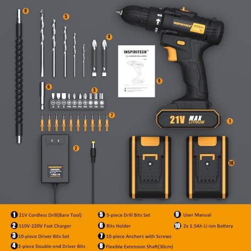 ✅ 【Do You Get Everything You Need?】What you will get with a BPD9221 battery-powered drill set: 1×21 volt Inspiritech Cordless Power Drill, 2x Rechargeable Battery, 1x English User Manual, 10x self-drilling drywall anchors,10x Screwdriver Bits, 2x Double Ended Bits, 3x Drilling Bits, 1x Magnetic Extension Socket Bit Holder, 10x Anchors with Screws,1x one-hour fast Charger, 1x Flexible Extension shaft, 1x Carrying Bag. Please reach out for any help in need, we will reply within 24 hours.