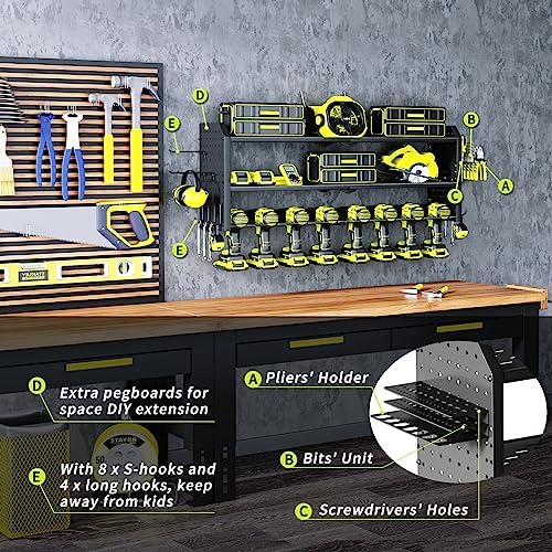 FLEXIBLE SPACE ADJUSTABILITY: The middle plate can be adjusted within 6 levels of height (also can be detached for the widest space). You can now DIY your space based on which kind of power tools and their charge bases, batteries, and accessories boxes. Come and experience the ultimate in storage with the power tool organizer wall mount!