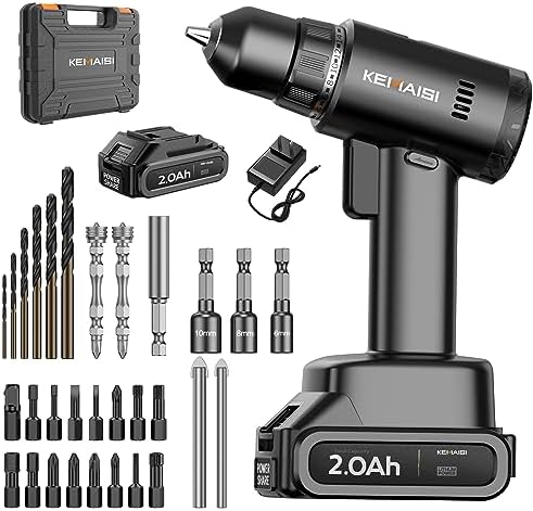 EFFICIENT: KEMAISI 20V drill delivers 2 speeds (0-500 and 0-1,600 rpm). The low speed is for driving screws, the high speed is for drilling holes. 2.0Ah rechargeable lithium-ion battery supports long battery life and can screw 700 screws after fully charged.