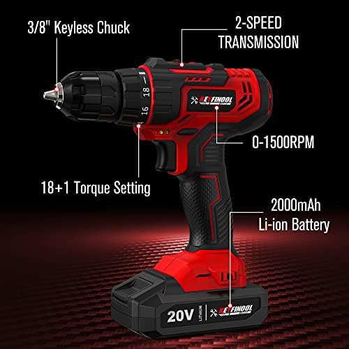 KEYFINOOL 20V Lithium-Ion Cordless Drill Set, 18+1 Power Drill Kit With 2.0Ah Battery & 1H Fast Charger, 2-Variable Speeds, 265 In-lbs Torque Power, LED Light, 22pcs Driver/Drill Bits