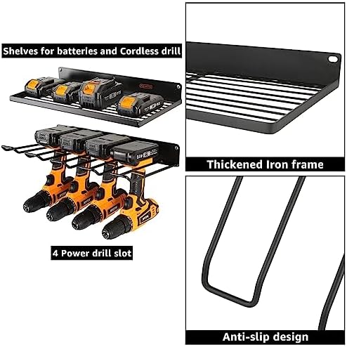 【High Quality Material】The power tool storage is made of heavy-duty metal. The surface has a black coating, which is anti-corrosion, anti-rust and waterproof, and durable. Strong load-bearing capacity, a single drill charging station can bear 60 lbs.