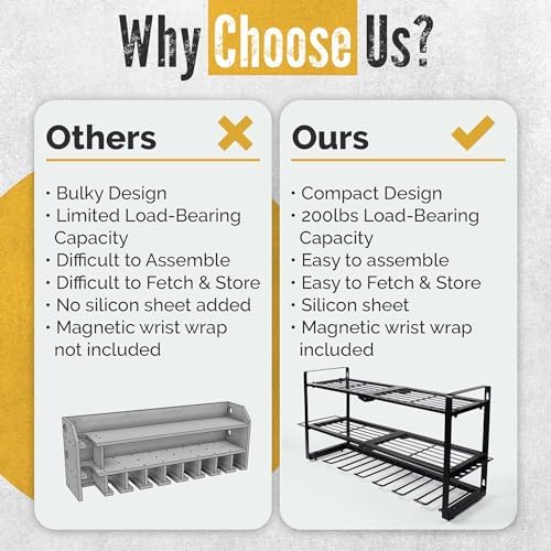 Extras : This Tool Storage Rack is equipped with additional accessories, including a Silicone sheet designed to prevent tools from sliding or scratching against the organizer’s surface and a Magnetic wristband to keep your screws firmly affixed on your wrist while drilling