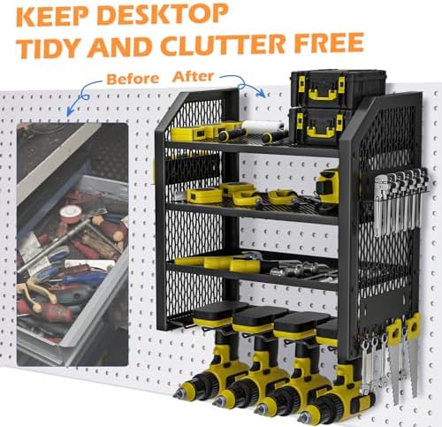 LARGE SIZE POWER TOOL ORGANIZER WALL MOUNT: Our power tool organizer has 4 layers of storage, it can store many heavy tools and various small tools without dropping. With extra storage spaces on both sides to hold hammers, various-sized wrenches, etc. The height of the side brackets can be adjusted as needed. Solve all your tool storage problems!