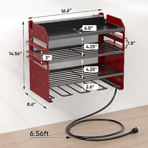 UNIQUE DESIGN WITH CHARGING STATION, UPGRADED AND REINFORCED: Equipped with 8 125V/15A/1875W sockets , a 6.56-foot power cord and surge protection of 1200J to meet your needs for convenient charging of many charging tools and cordless electric drill batteries. The heavy duty designed power tool rack will help you load multiple heavy tools using all 4 wall anchors.