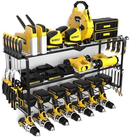 Power Tool Organizer Wall Mount, 7 Drill Holder Cordless Power Tool Wall Organizer, 3 Layers Power Tool Holder and Power Tool Storage Rack with Screwdriver Holder/Plier Holder/Hammer Holder/Hooks