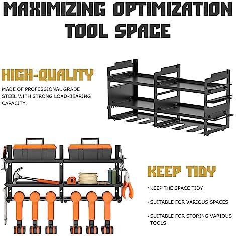 [Optimized design] : Our tool holder has been upgraded with 6 drill seats, and more accessories have been added to the side for maximum convenience and functionality. Battery boxes, hammers and other tools can be placed on the upper two layers, large capacity design, can place more tools, keep your tool room clean and tidy.