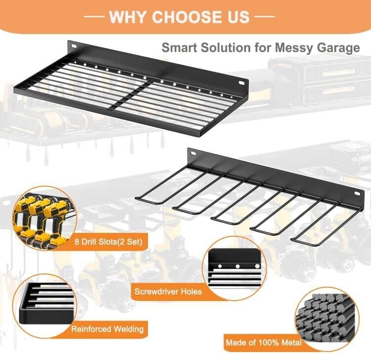 【Garage Space Saver】Featuring a versatile wall-mounted design, this organizer shelf set is ideal for decluttering any workspace. The drill holder wall mount provides a secure and easily accessible home for all your cordless drills and power tools, this tool storage rack is the ultimate solution for organizing your power tools and maximizing your workspace.