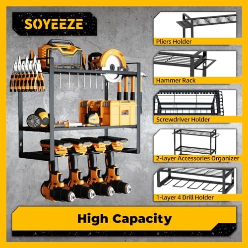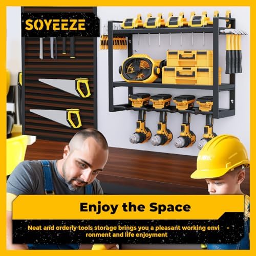 EASY INSTALLATION: SOYEEZE power tool storage rack can be set up in a few minutes even if without instructions. Whether you are a first-timer to the craft world or a seasoned handy person, you will find no difficulty in the processing on our garage tool holder.