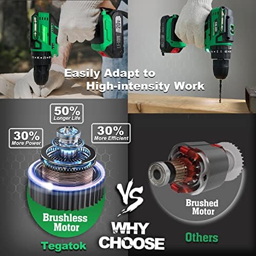 [Durable and Efficient Brushless Motor]: Compared with ordinary power drill cordless, Tegatok brushless drill can improve work efficiency by 30% and prolong machine life by 50%. The brushless motor can reduce friction and heat during use, consuming less energy. and it can greatly reduce the noise and loss of the electric drill. Perfect for professional and home use. Ensuring your work is more efficient and convenient.