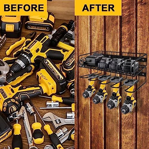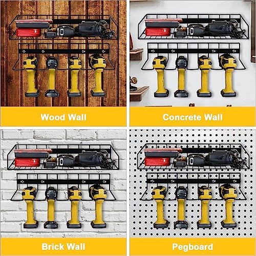 HIGH QUALITY:The power tool organizer is made of high quality alloy material steel, high strength and no rust.The strong welds make it possible to hang and place heavy objects without breakage. Four mounting holes can make it more firmly fixed to the wall. The shelf spacing is smaller, the load-bearing capacity is greater, and the top of the hanging shelf is bent upward to effectively prevent hanging items from falling.