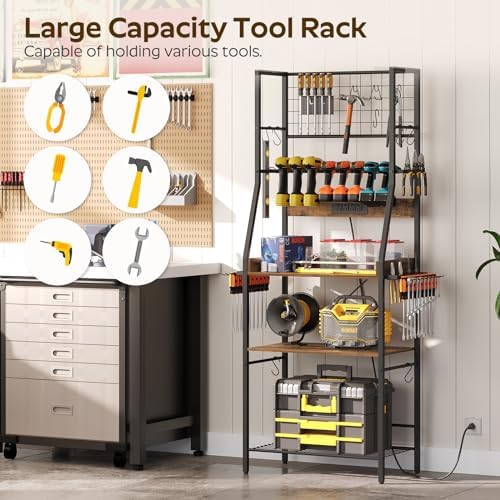 YATINEY Large Power Tool Organizer, 8 Drill Holder with Charging Station, Garage Tool Organization with 2 Side Pegboards, Metal Tool Shelf with 11 Hooks, for Garage, Rustic Brown UR01BR
