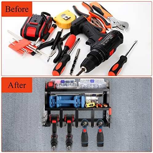 Three Tiers Drill Holder: The 3 tiers design helps you clarify your tool kits. The 4 drill hanging slots measure 1.5″ wide and 6.7″ deep to fit most cordless drill models. Also, there are holes designed besides the rack, suitable for put your screwdrivers in them.